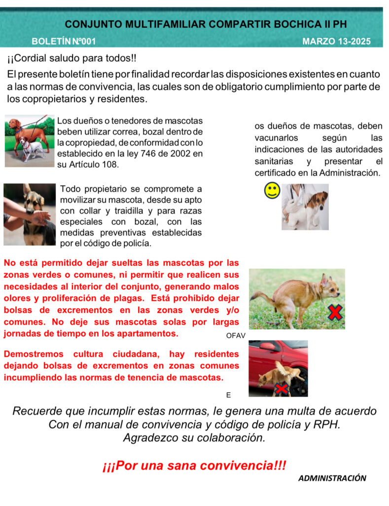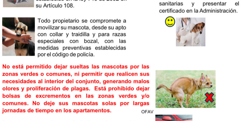 Les recordamos la importancia de cumplir con las normas de convivencia y tenencia responsable de mascotas en nuestro conjunto residencial: